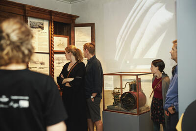 Vår nyeste utstilling handler om industrialiseringa til sjøs, men også om sysselsetting av industriarbeidere hjemme. Utstillingen er delt inn i ulike tema med hovedvekt på brytningstiden mellom seil og damp, verftsindustri i Trondheim, og oppstart og etablering av byens største rederi; Nordenfjeldske Dampskibsselskab. I tillegg har vi innredet en stue fra ca. 1930 som viser hvordan de hjemme hadde det mens familiemedlemmer var til sjøs. Vanskelige tema som sjøfolk i krig er også en del av denne utstillingen som strekker seg fra 1850 til 1950. Det skjedde en voldsom utvikling innenfor skipsindustrien i denne perioden, men også for sjøfolkene da seil ble erstattet med damp.